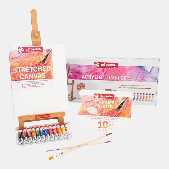 Αυτό το συνδυαστικό σετ είναι το απόλυτο σετ εκκίνησης για όσους θέλουν να ξεκινήσουν το ταξίδι τους στη ακρυλική ζωγραφική! Το σετ περιέχει όλα όσα χρειάζεστε για να ξεκινήσετε: ένα σετ ακρυλικών χρωμάτων με σωλήνες 12 x 12 ml σε βασικά χρώματα για να φτιάξετε την παλέτα σας, ένα εύχρηστο επιτραπέζιο καβαλέτο, έναν τεντωμένο καμβά 24 x 30 cm, 2 ακρυλικά πινέλα ζωγραφικής και ένα χάλι -Δωρεάν παλέτα αποκοπής.